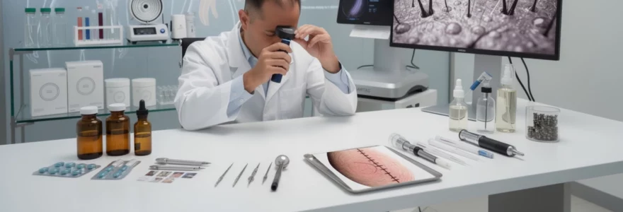 En pratique, les dermatologues spécialisés s’appuient sur différents outils. La trichoscopie (dermoscopie du cuir chevelu) permet d’analyser le diamètre des cheveux, la proportion de cheveux miniaturisés, la présence de signes inflammatoires ou cicatriciels. Le phototrichogramme ou les systèmes de photographie standardisée haute résolution (toujours sous le même angle, éclairage et distance) offrent une comparaison visuelle fiable au fil des mois. Dans certains cas, des comptages de cheveux dans une zone de référence peuvent être réalisés pour quantifier précisément l’évolution.